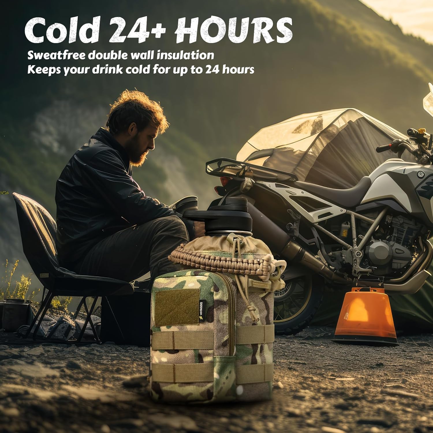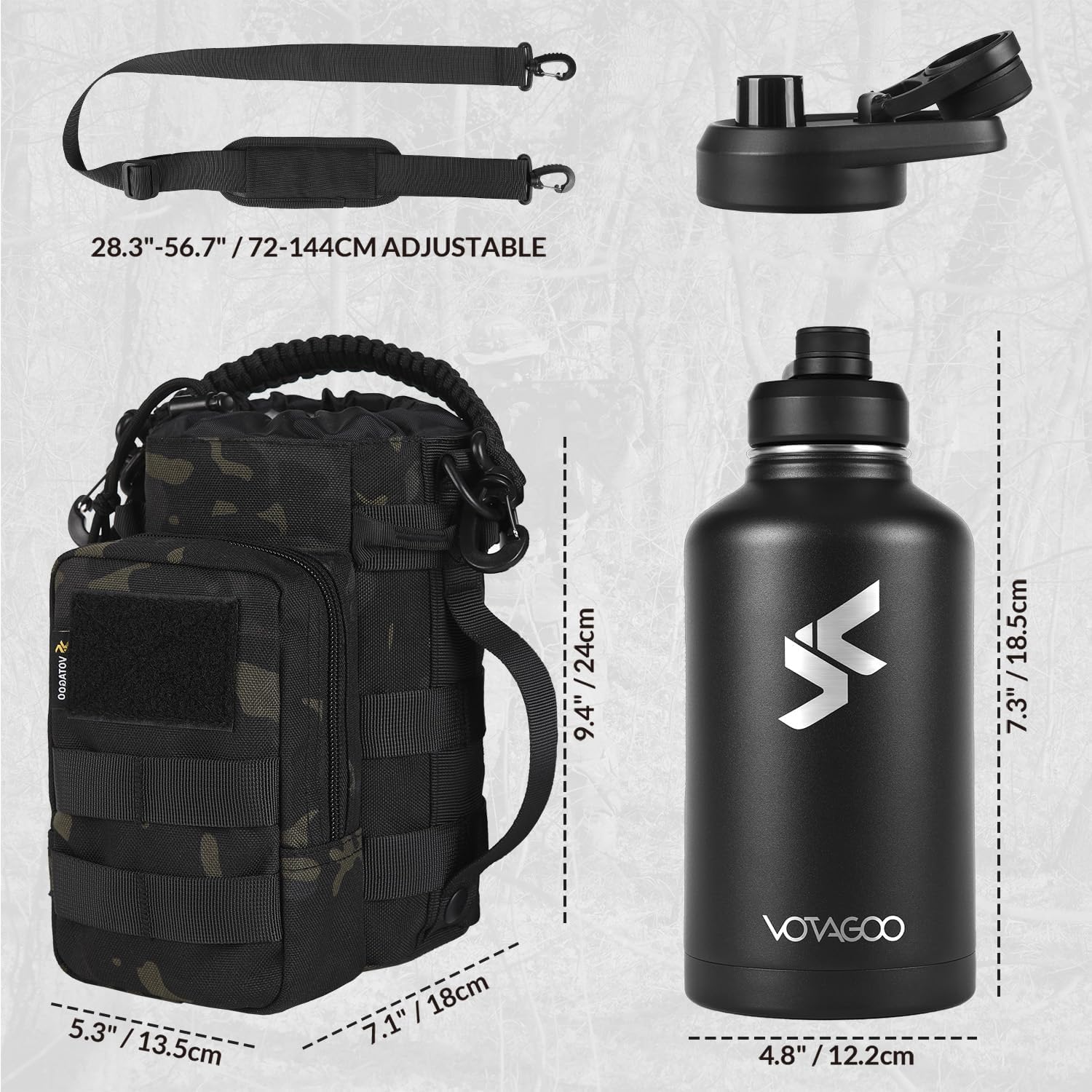 The rugged 64 oz bottle sleeve is crafted from premium, tear-resistant nylon. It’s removable and washable, with MOLLE webbing for easy attachment. The large storage compartments help organize essentials like your phone, keys, and wallet. The hand support strap offers easy pouring, while the paracord handle and detachable shoulder strap provide multiple carrying options. Ideal for military personnel, police officers, and outdoor enthusiasts, this bottle provides reliable hydration while keeping essential gear close at hand.