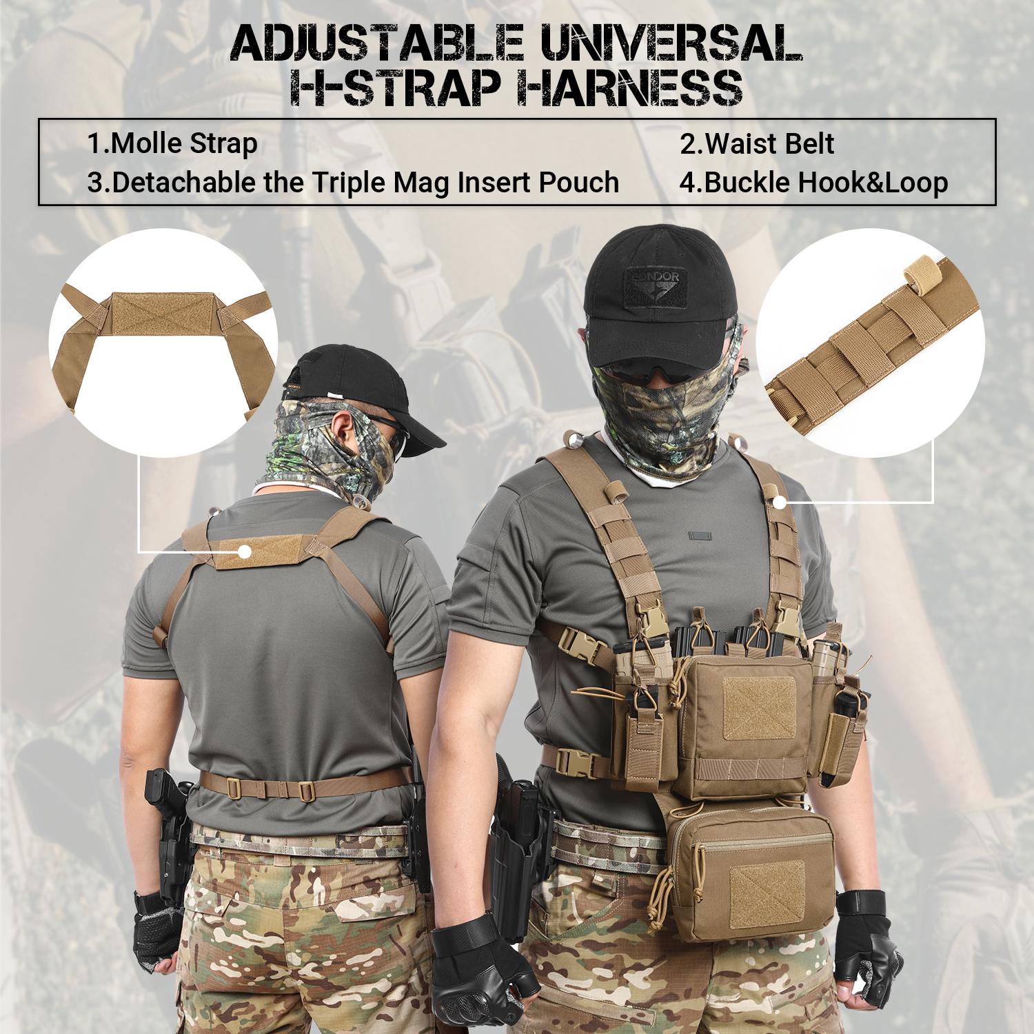 This chest rig comes with four rifle magazine pouches, compatible with 5.56/7.62 magazines. The side pouches are removable and include 9mm mag pouches, providing flexibility for various ammo types. Designed for military personnel, survivalists, outdoor enthusiasts, airsoft gamers, mask gear players, and police officers, this rig includes PALS/MOLLE straps on the main bag, additional pouch, and shoulder straps, allowing you to attach extra gear for enhanced operational efficiency in any scenario.