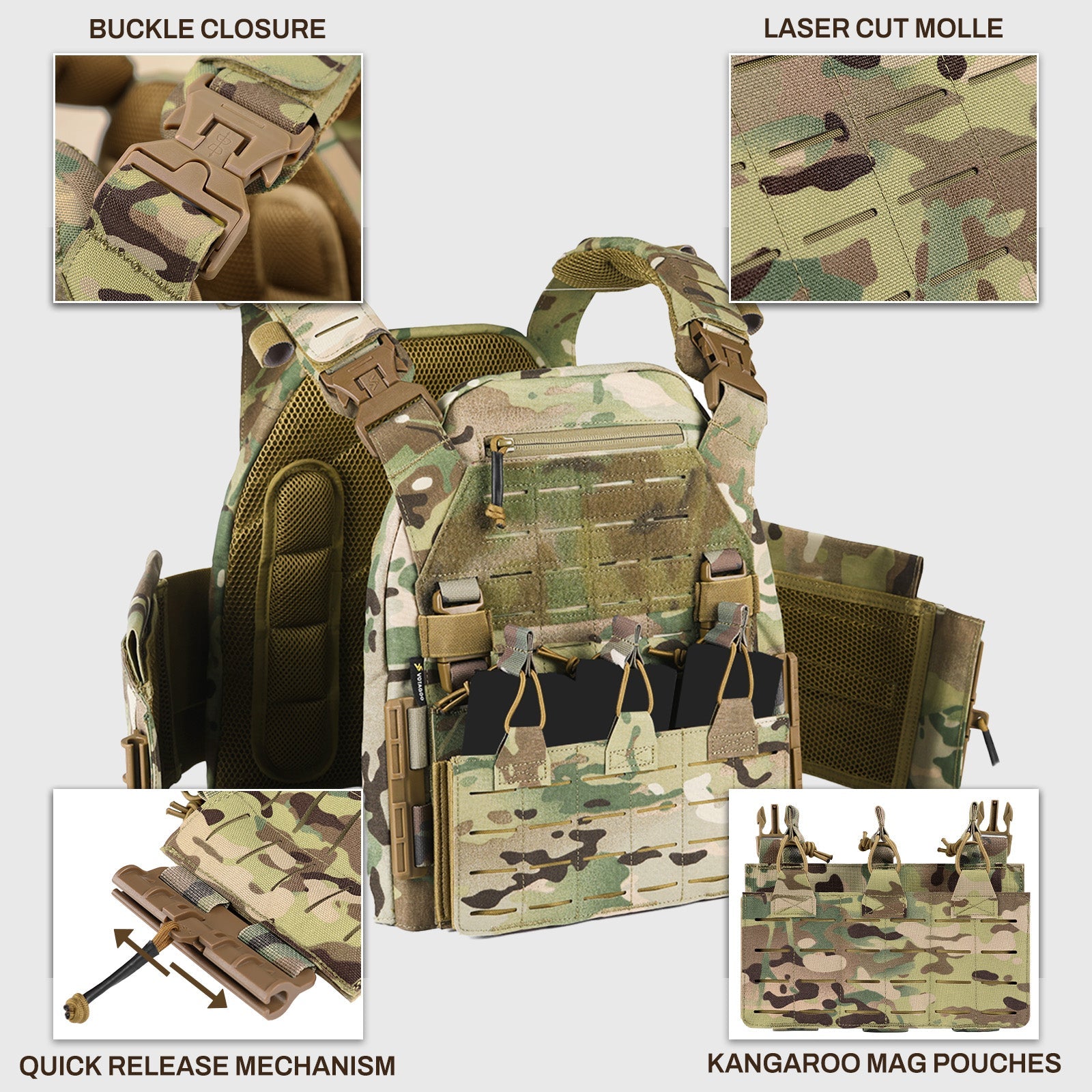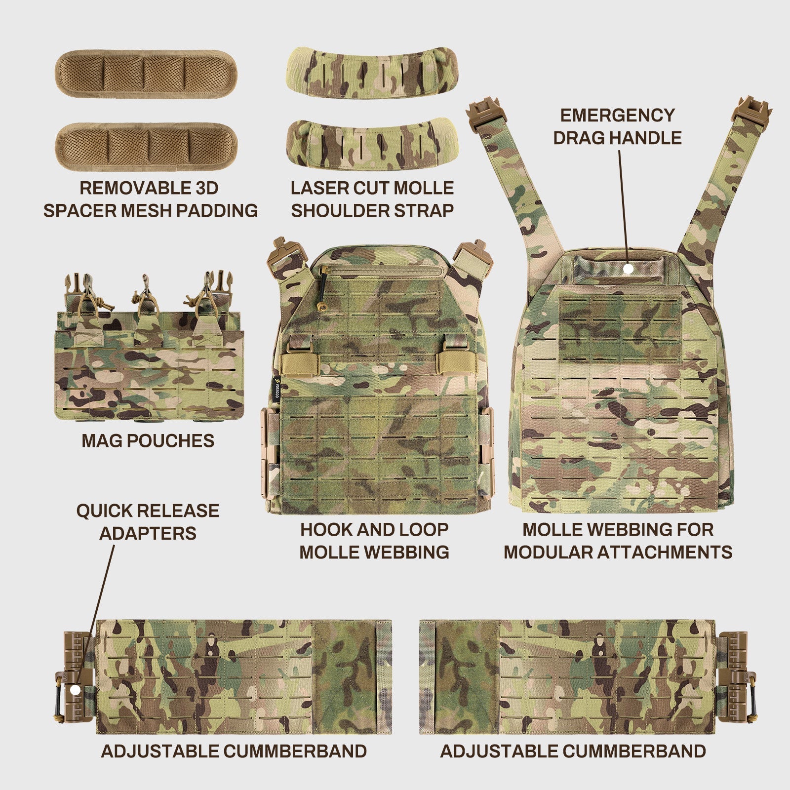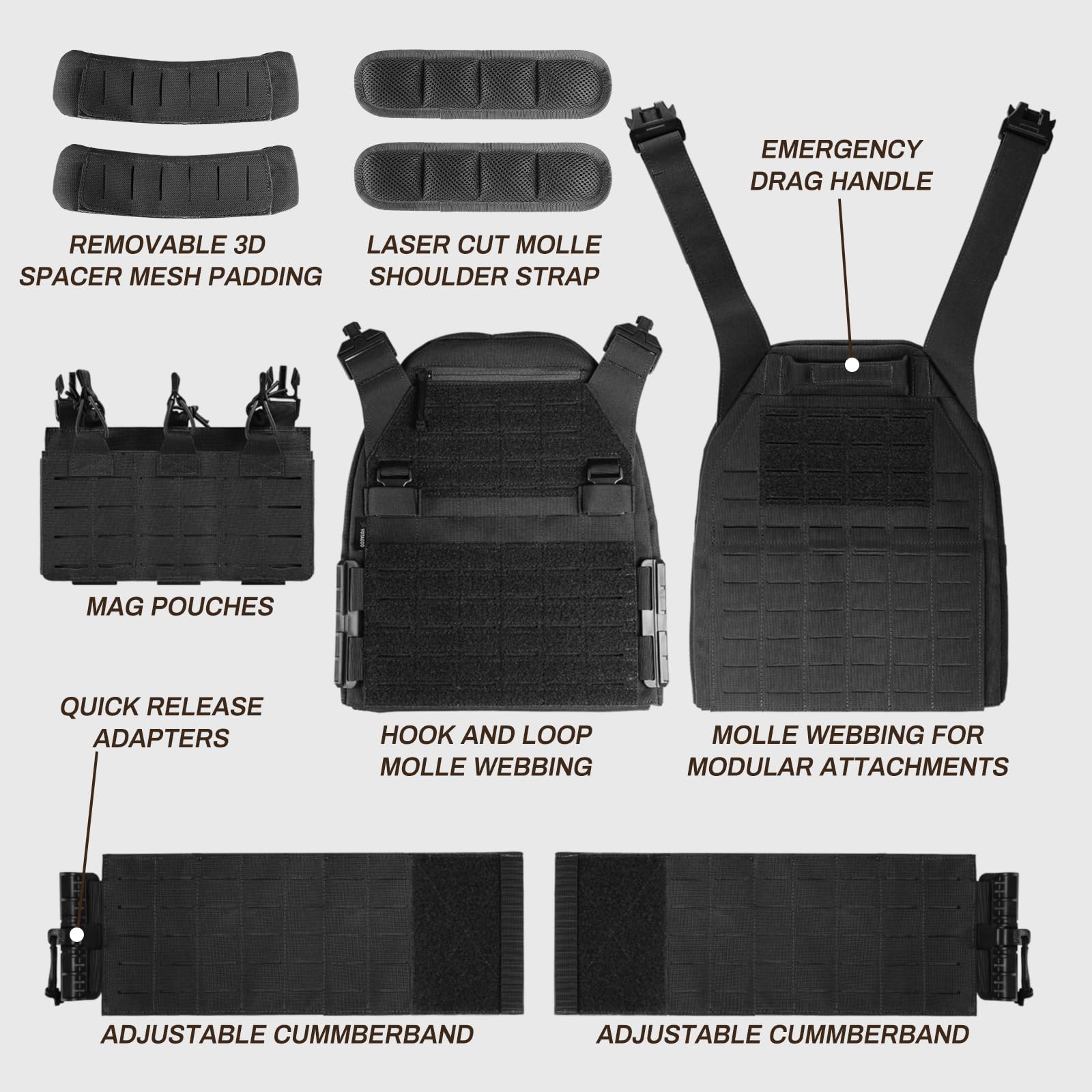 Compatibility & Expandability: Ideal for tactical operators and gear enthusiasts, this vest features MOLLE attachments throughout, allowing for complete customization. It can accommodate additional modules and protective gear such as shoulder and neck guards, enhancing safety and functionality in the field.