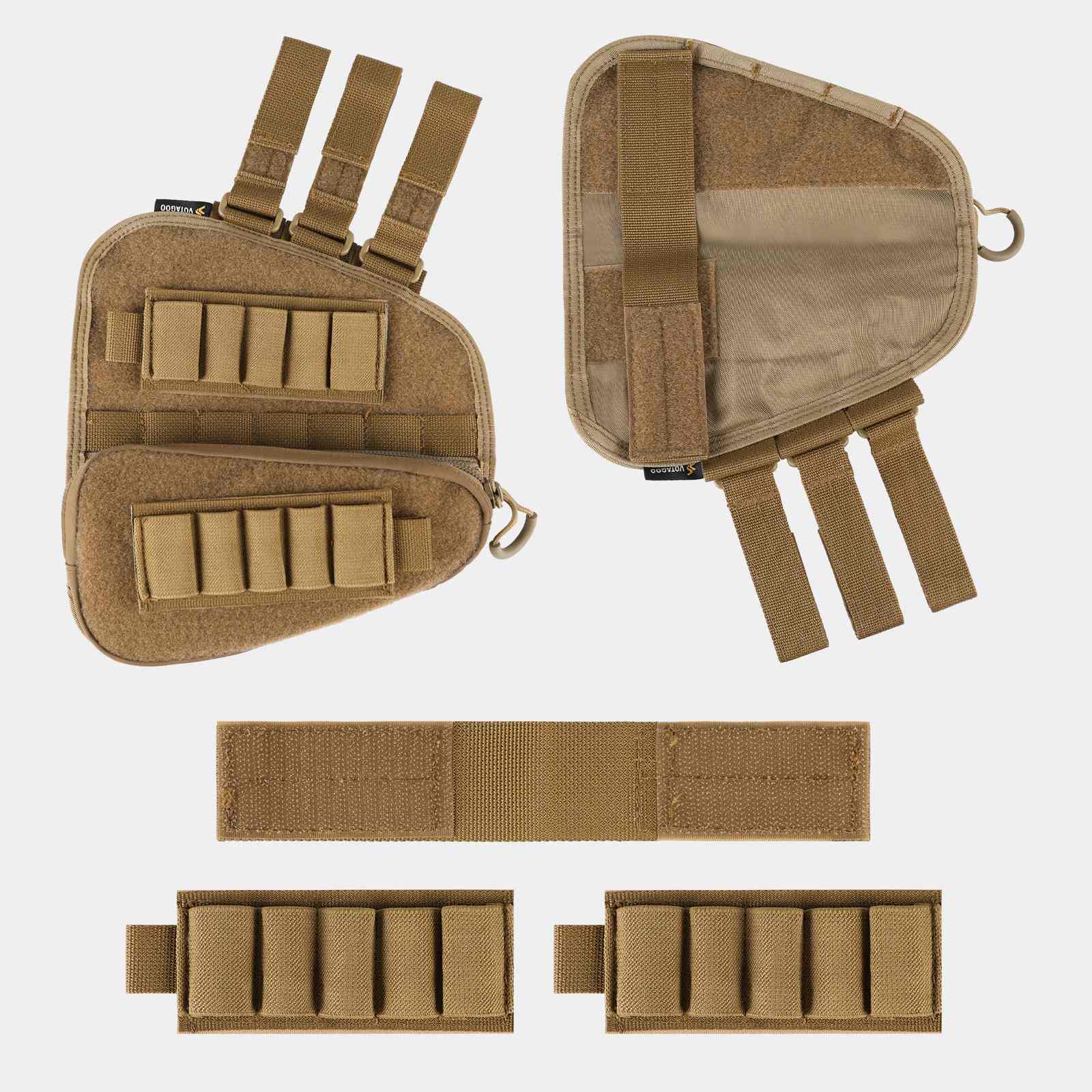 Equipped with 2 removable 5-round 12 gauge ammo shell holders, this pouch allows you to carry extra shells for quick reloads. Designed to meet the needs of military personnel, survivalists, outdoor enthusiasts, airsoft gamers, mask gear players, and police officers, this gunstock pouch ensures quick access to ammunition during critical situations, whether in the field, on duty, or during tactical training. The entire design includes a hook-and-loop panel, perfect for attaching patches or additional ammo holders.